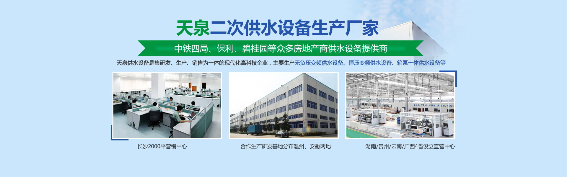 長沙天泉供水設(shè)備有限公司位于長沙雨花經(jīng)濟開發(fā)區(qū)。公司是集研發(fā)、生產(chǎn)、銷售為一體的現(xiàn)代化科技型企業(yè)公司生產(chǎn)銷售的產(chǎn)品有無負壓變頻供水設(shè)備、自來水加壓泵站、變頻調(diào)速恒壓供水設(shè)備、智慧標準泵房、智慧水務(wù)、一體化預制泵站、循環(huán)水系統(tǒng)工程等二十幾大類別。